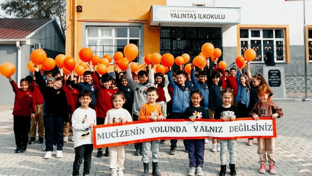 LÖSEV öncülüğünde okul bahçesinde gerçekleştirilen etkinlikte öğrenciler, ellerinde “Mucizenin yolunda yalnız değilsiniz” yazılı pankartlarla lösemi hastalarına destek mesajı verdi.